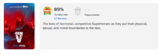 《黑袍纠察队》衍生剧《V代代》第二季于9月17日在Prime Video首播,剧集的点评现已出炉。截止至发稿前,依据闻名影评网站烂西红柿的评分显现,《V代代》第二季的烂西红柿新鲜度为89%,不少影评人对其进行了盛赞,以为《V代代》第二季会很对《黑袍纠察队》粉丝的食欲,且剧情结构契合常理,有许多的精彩之处。